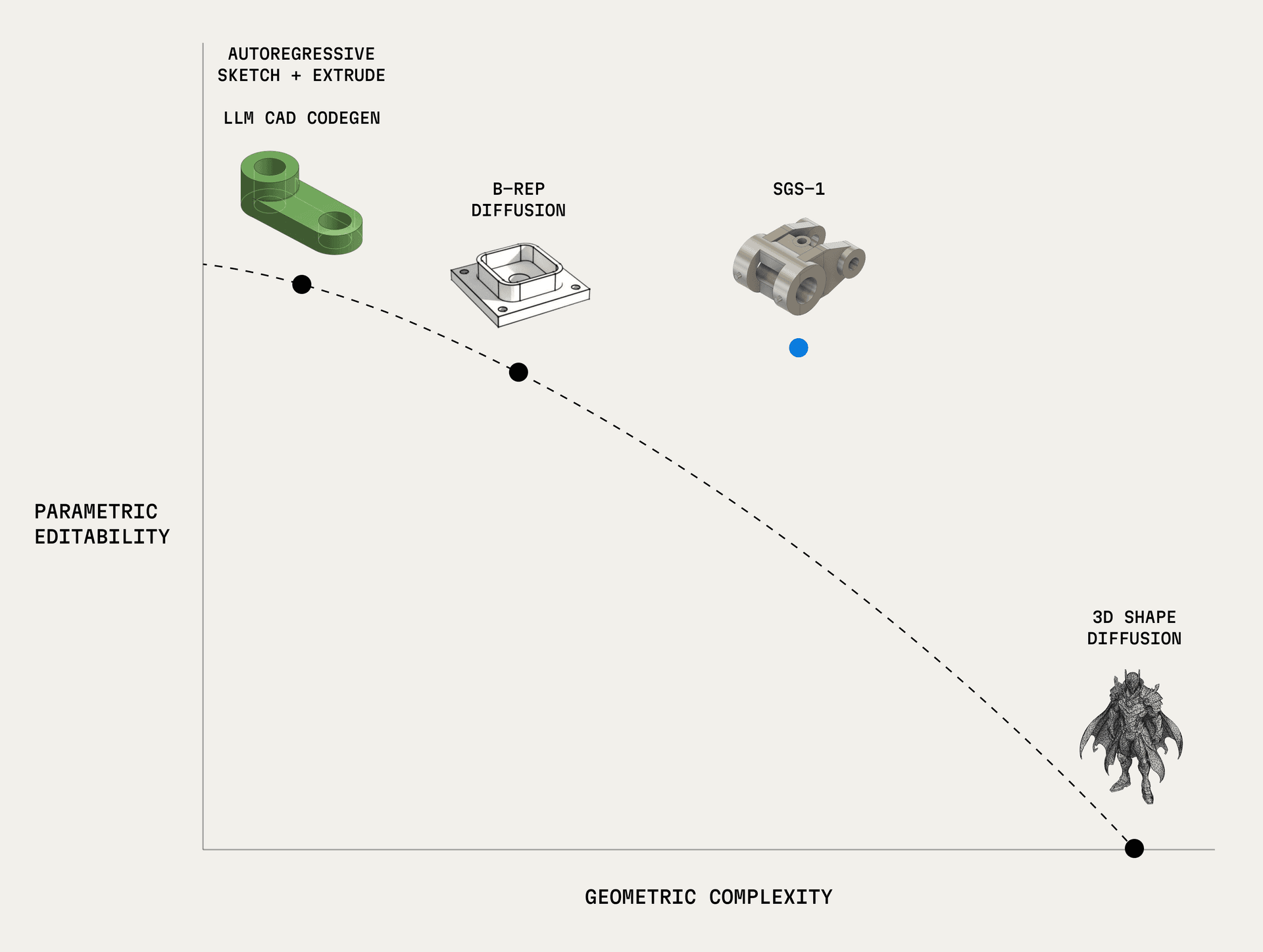 We recently announced SGS-1, our state-of-the-art generative model for 3D CAD. Existing generative CAD/3D architectures exist on a frontier, trading off complexity for editability. In this post, we'll briefly touch on the strengths and weaknesses of various existing methods, and how SGS-1 achieves results beyond the current frontier.