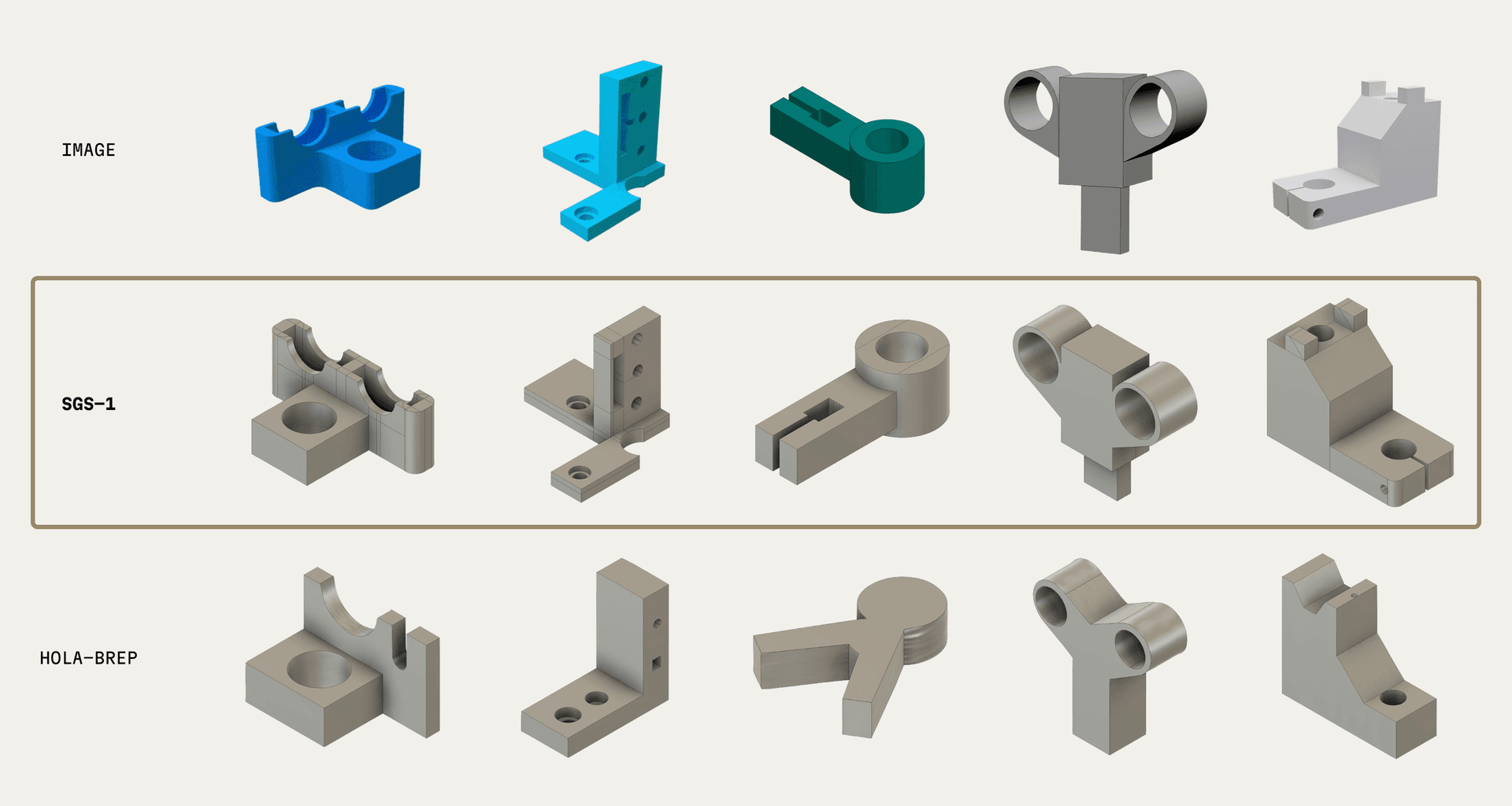 SGS-1 generalizes much more effectively at test time than existing B-rep generative models, leading to greater success rates on more diverse and complex geometry. In the graphic below, we show comparisons against the best available image-conditioned B-rep generative model, HoLa-Brep. To be as fair as possible, we only show examples where HoLa-Brep produced a valid closed watertight solid.Our outputs are constructed with a combination of an in-house implementation and an open-source geometry kernel, making it feasible for us to convert using any other commercial software such as Fusion360.