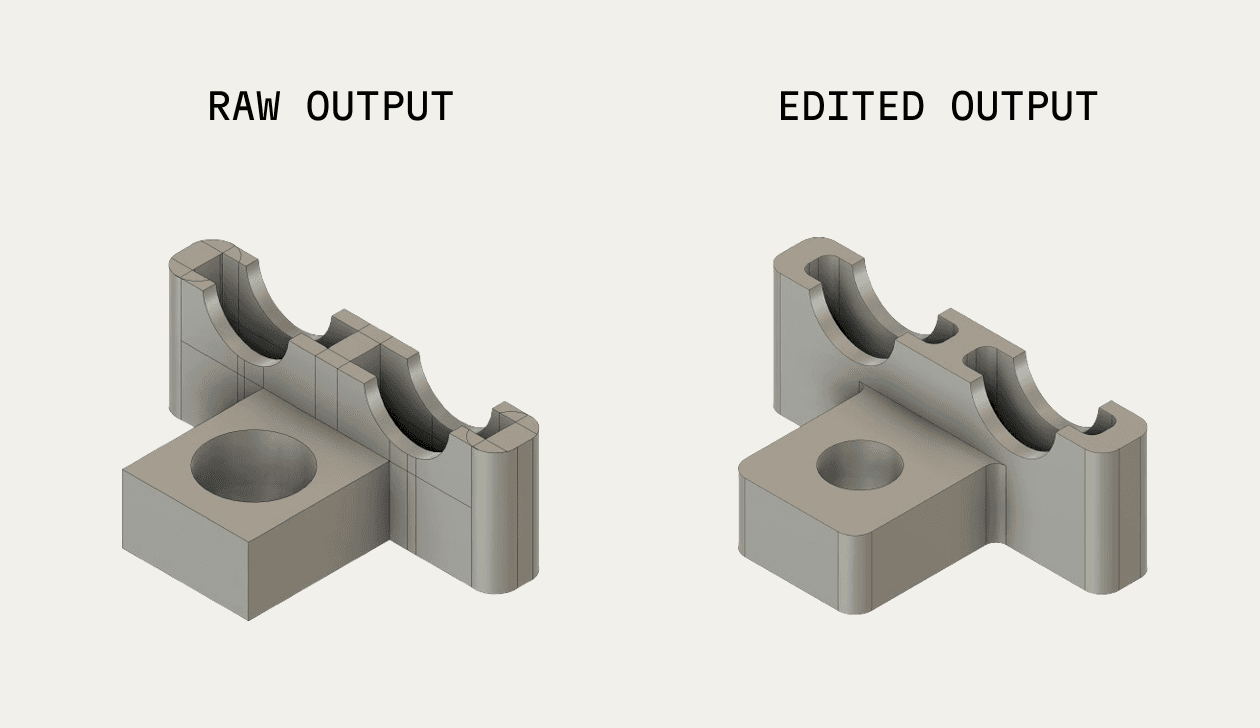 Unlike existing B-rep generative models, SGS-1 does not represent every surface with B-spline geometry - SGS-1 actually produces 3D primitives (planes, cylinders, cones, spheres, torii) where correct, meaningfully improving direct modeling editability of outputs in CAD software. For especially complex surfaces and edges, we do use B-splines as a representation, but doing so accurately and correctly is an ongoing area of research for us.